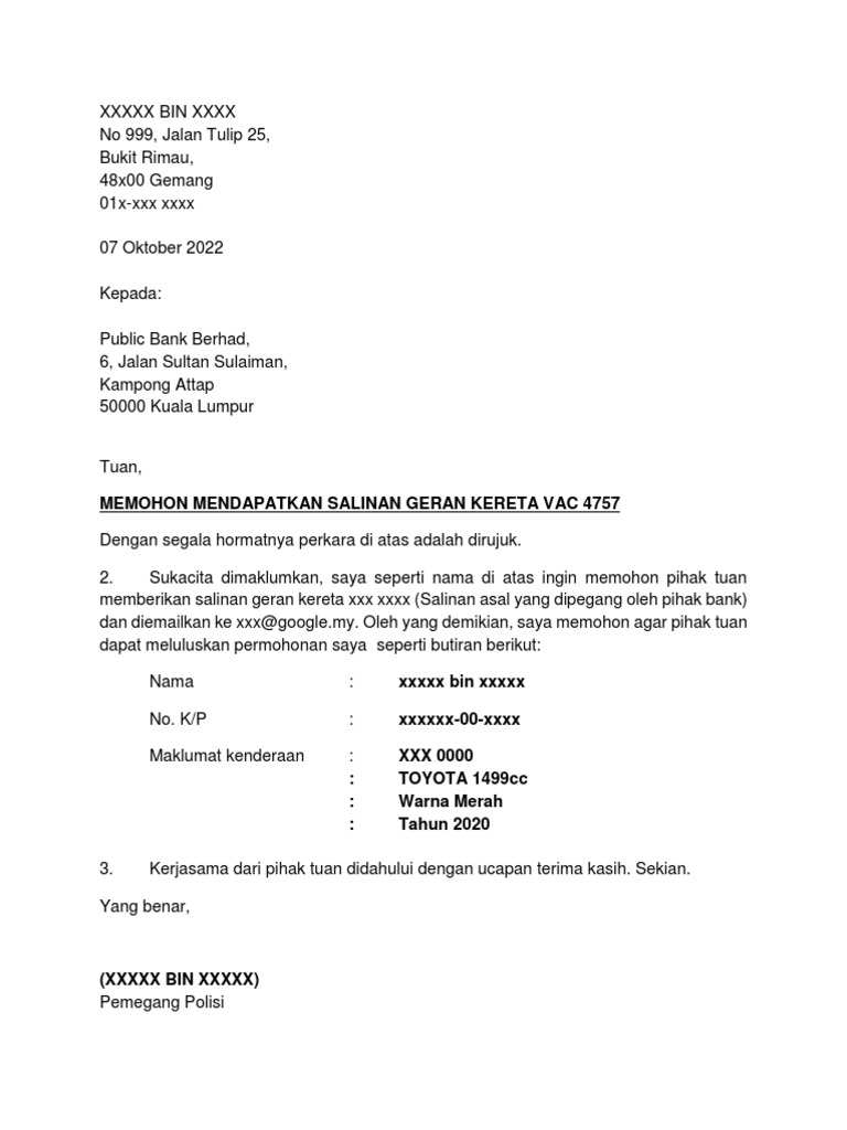 Adakah bank berhak simpan geran kenderaan kita. Yuk Lihat 9 Contoh Surat Ambil Geran Kereta Terbaik Ramon Hester. Geran Kereta In English Contoh surat ambil geran kereta di bank.